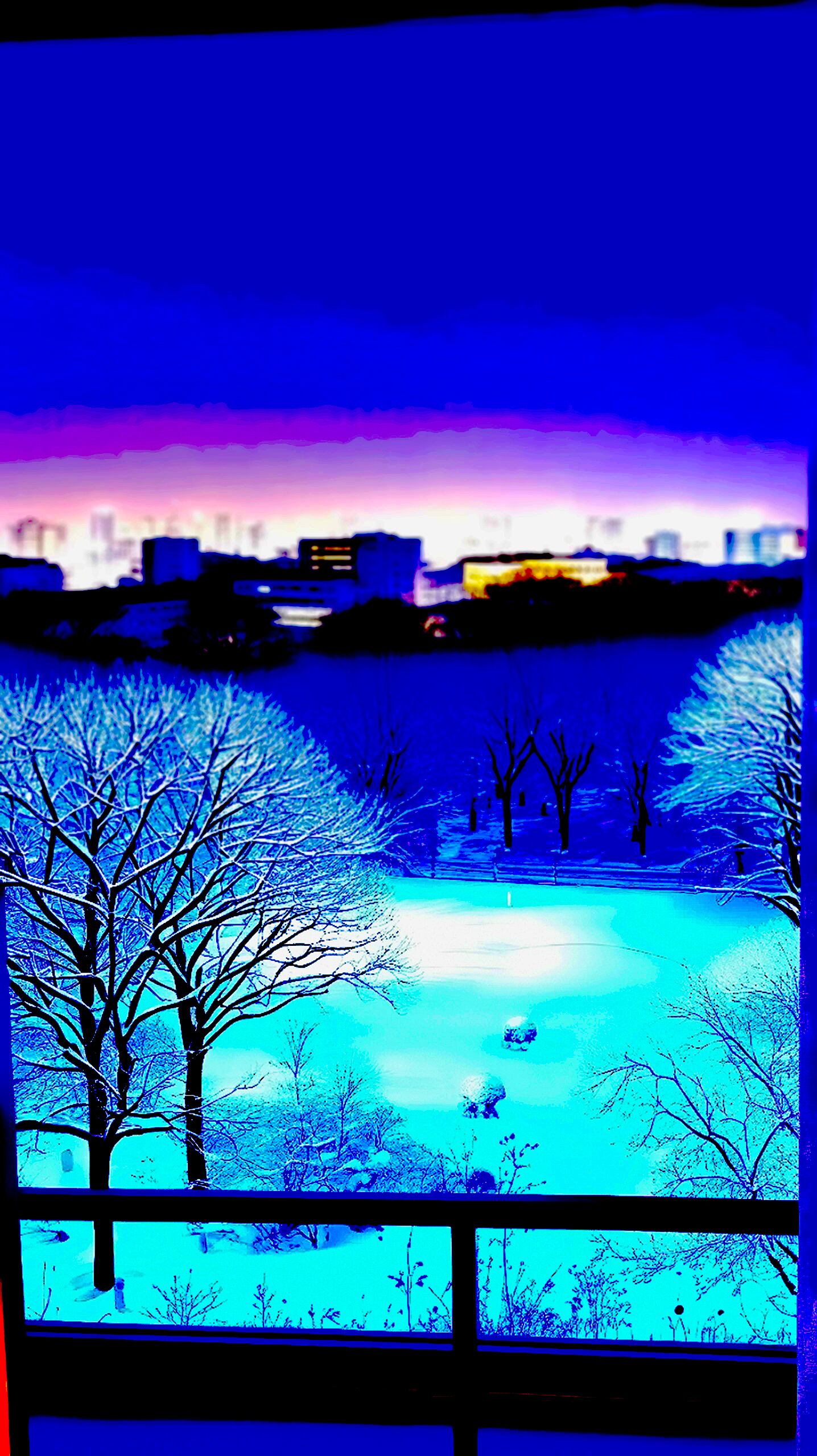 雪に覆われた静かな公園の向こうで、夜がゆっくりと明けていく。