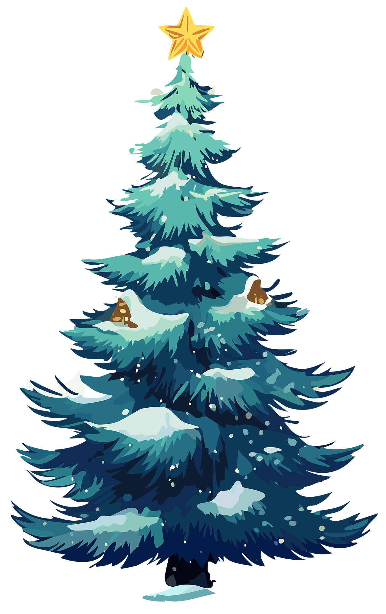 雪をまとった深緑のモミの木に、黄金の星が灯る静かなツリー。