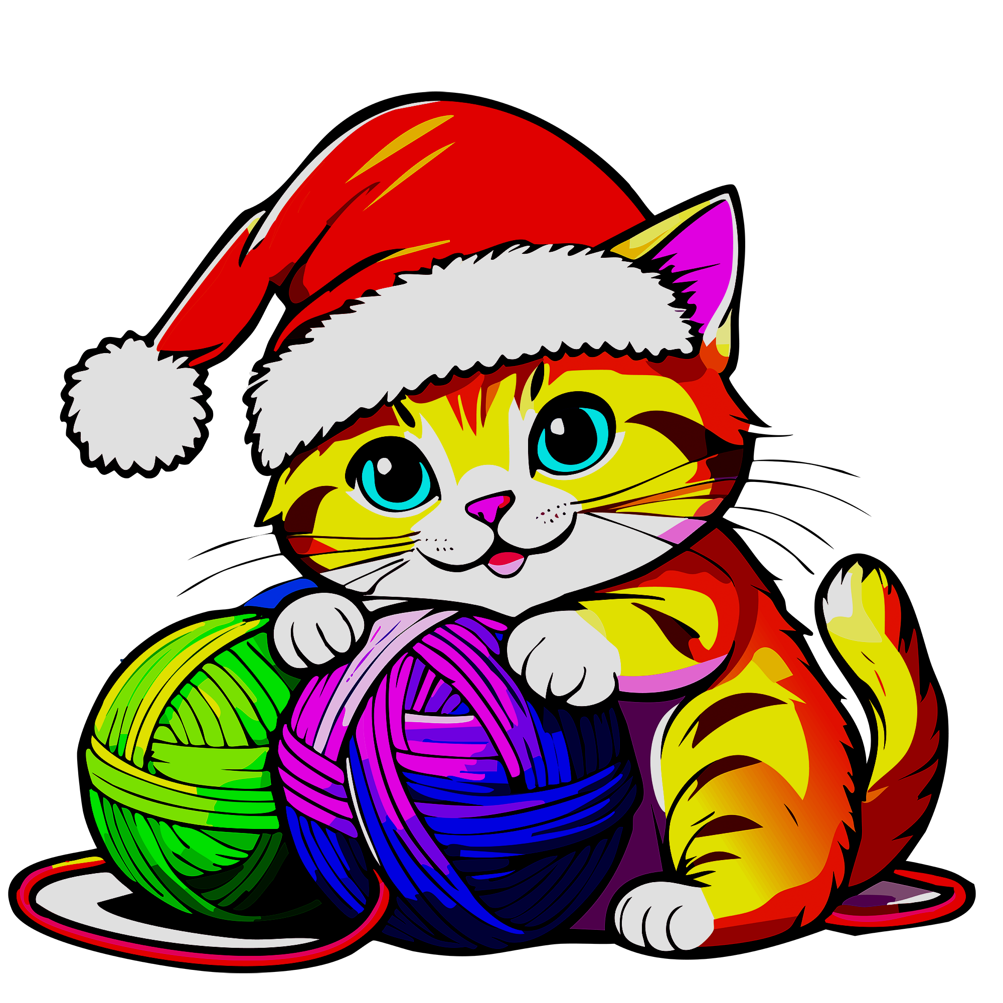 カラフルな糸玉とサンタ帽をかぶった、陽気なトラねこのクリスマスアイコン。