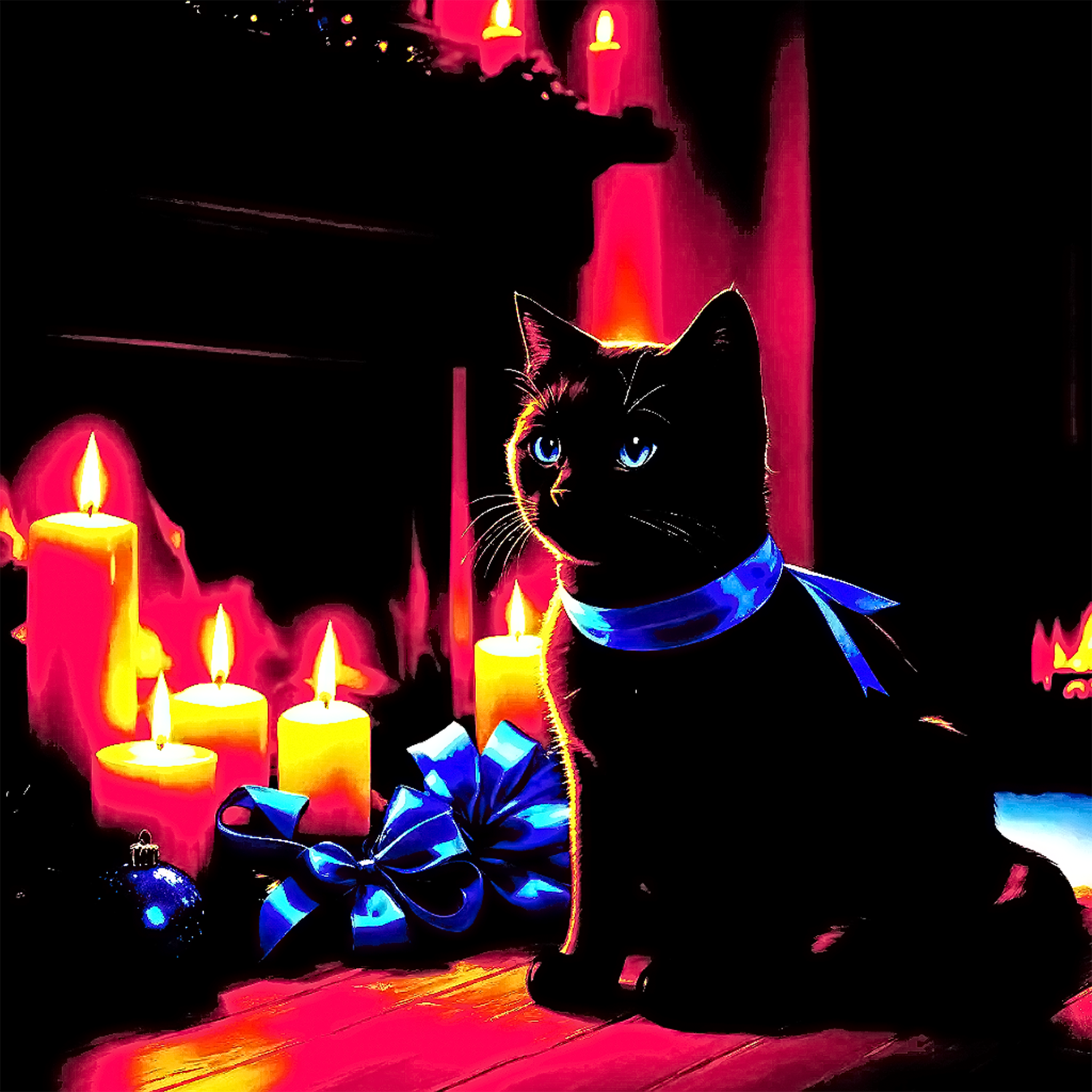 冬の夜を旅する黒猫を描いた幻想的なイラストシリーズ「Winter Journey」。