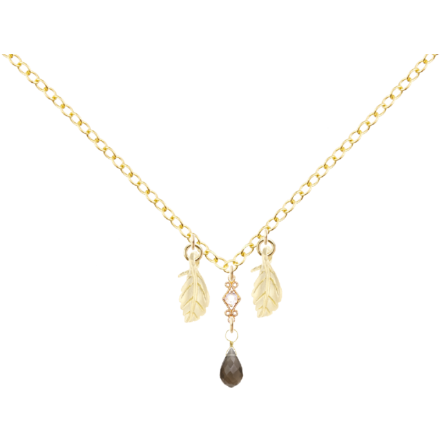 スモーキークォーツが胸元に静かな輝きを添え、凛とした印象を引き立てます。