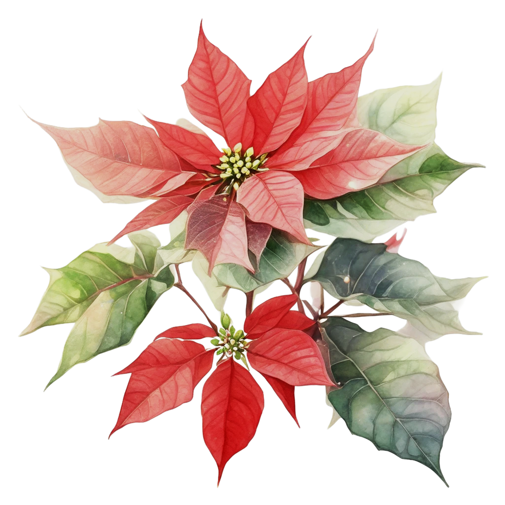 柔らかな筆致と淡い影が魅力の、クラシックな水彩ポインセチア。