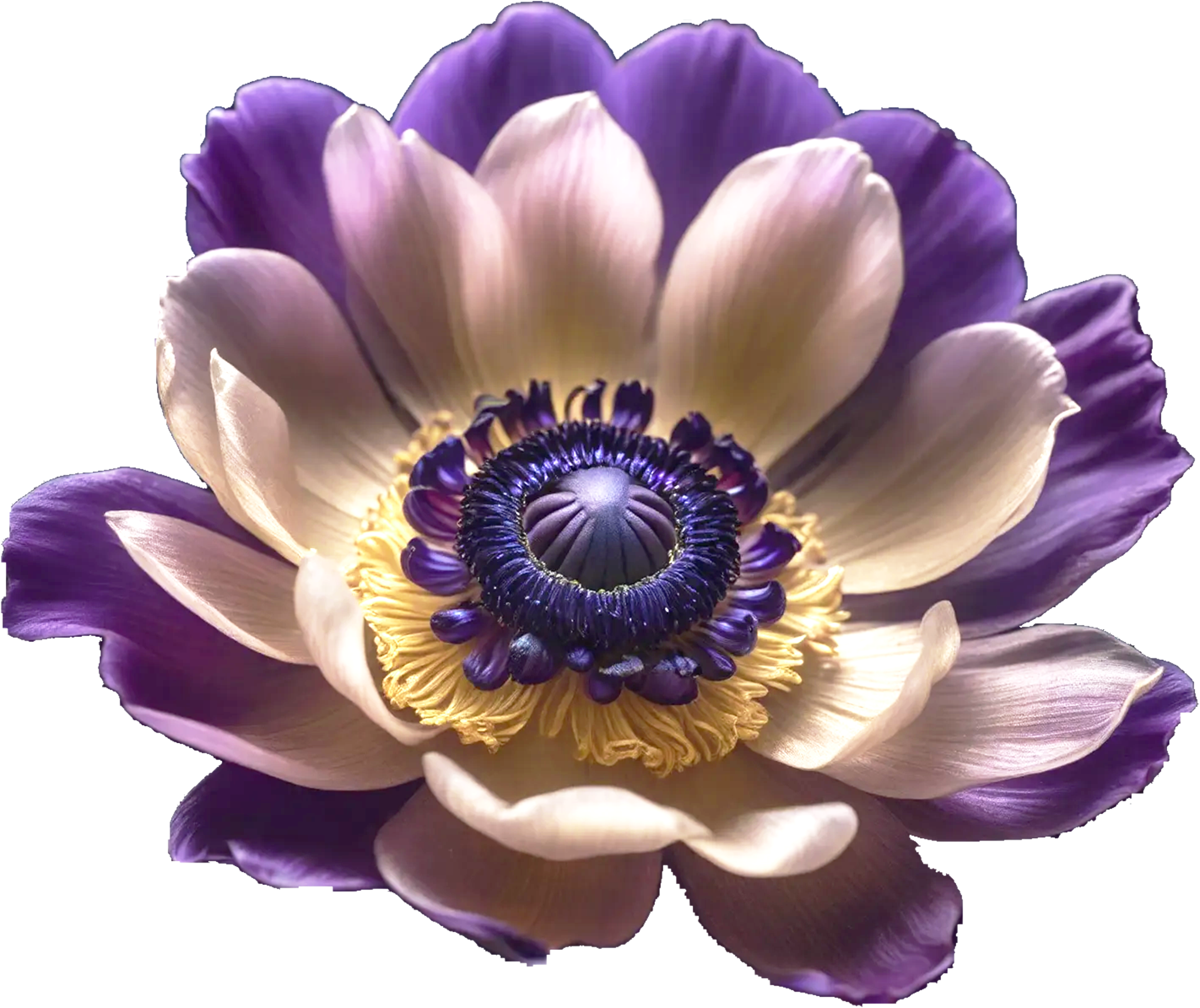 2月の花アネモネを、淡いクリーム色と紫の花弁で柔らかく仕上げた背景透過PNG素材です。