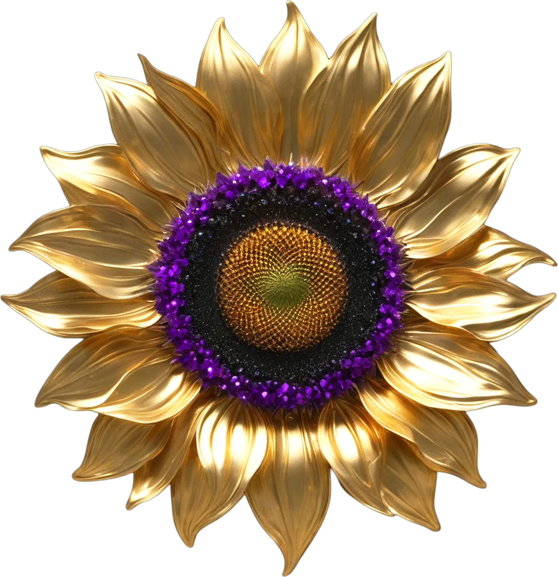 深い紫の結晶が黒い中心を囲み、外側に向かって黄金の花弁が力強く広がる、幻想的なひまわりアイコンです。