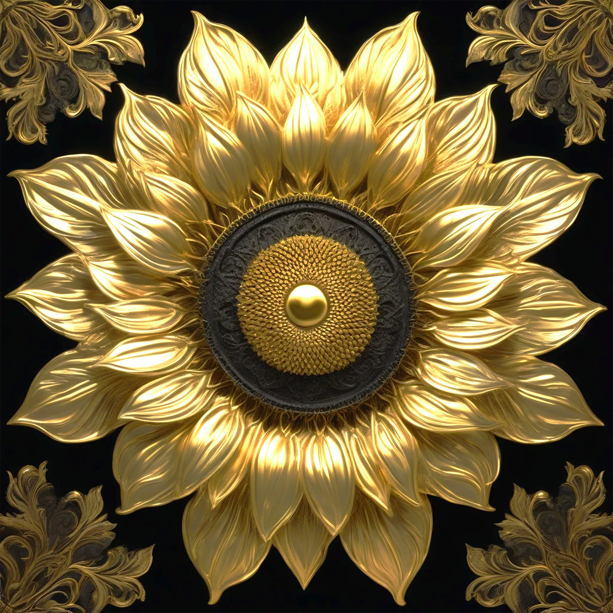 豪奢な金色の花弁が層をなし、中央に深みのある黒と黄金の円盤が輝く、荘厳なひまわりアイコンです。