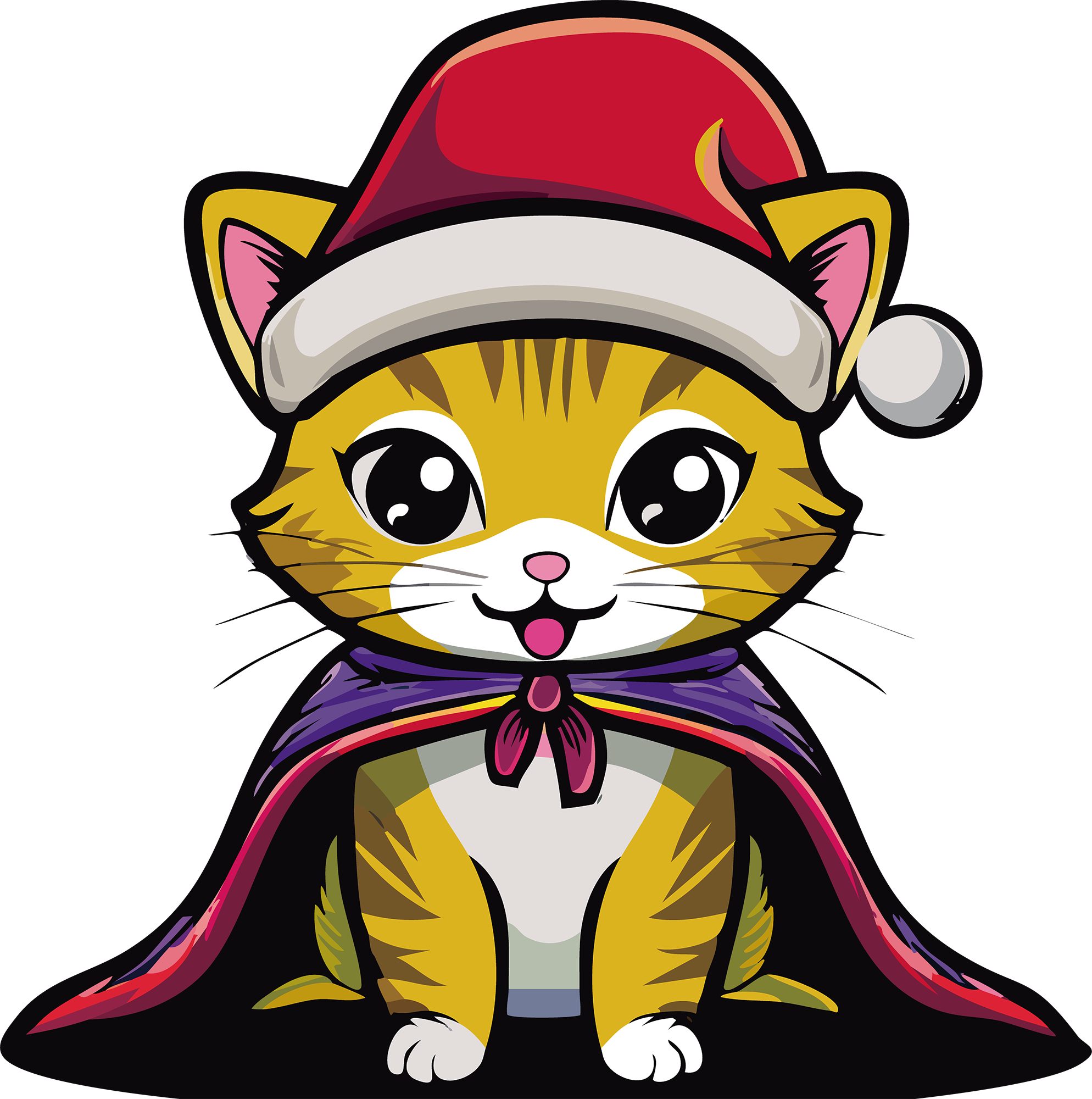 ちょこんと座り、帽子とマントをまとった可愛いサンタねこ。