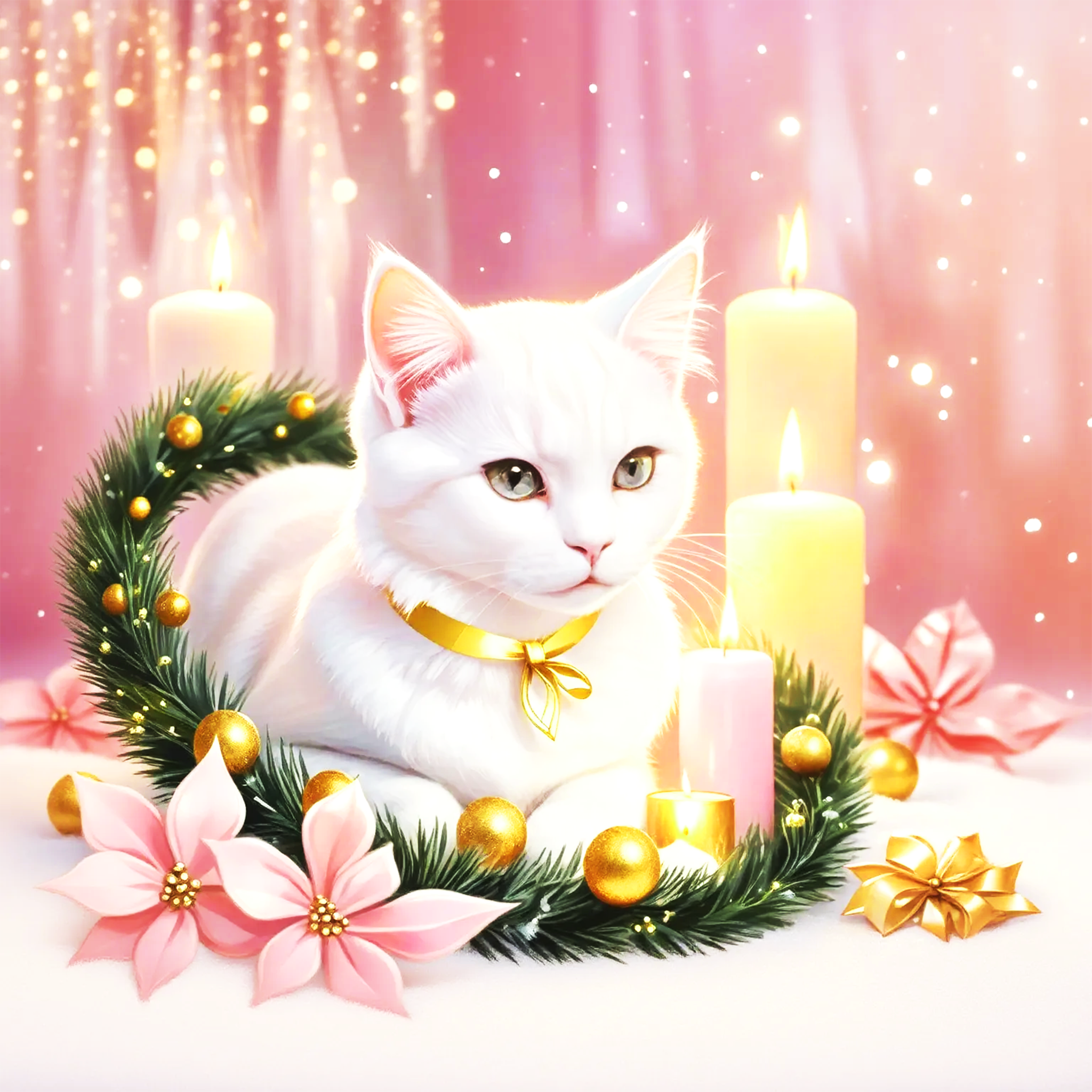 柔らかなキャンドルの灯りに包まれた白猫が、静かに佇む一枚。