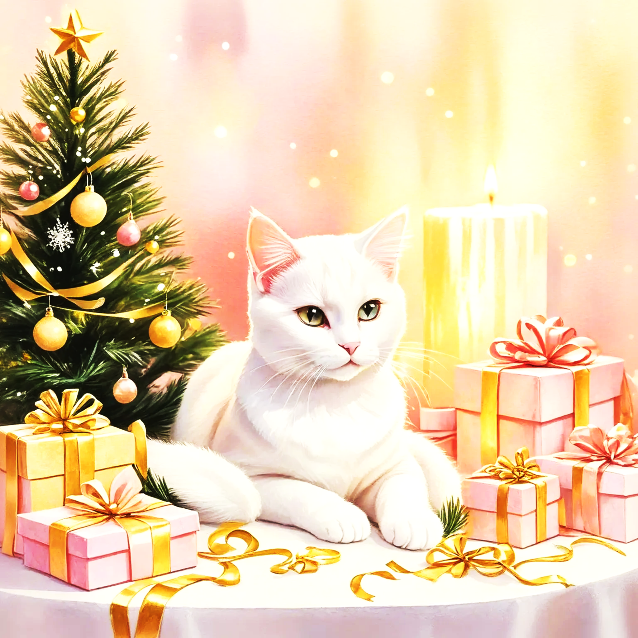 温かな光に照らされた白猫が、そっと贈り物を見守る姿は、冬の特別な時間そのもの。