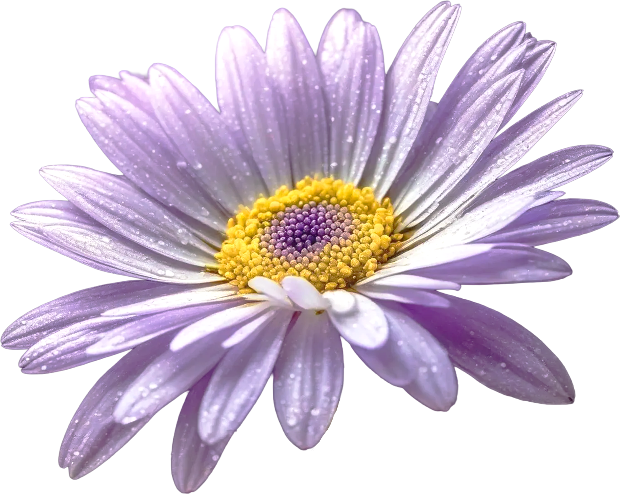 細かな光の粒が輝くラベンダーカラーのデイジーを、透明感を損なわず丁寧にレタッチした高品質デジタル素材です。