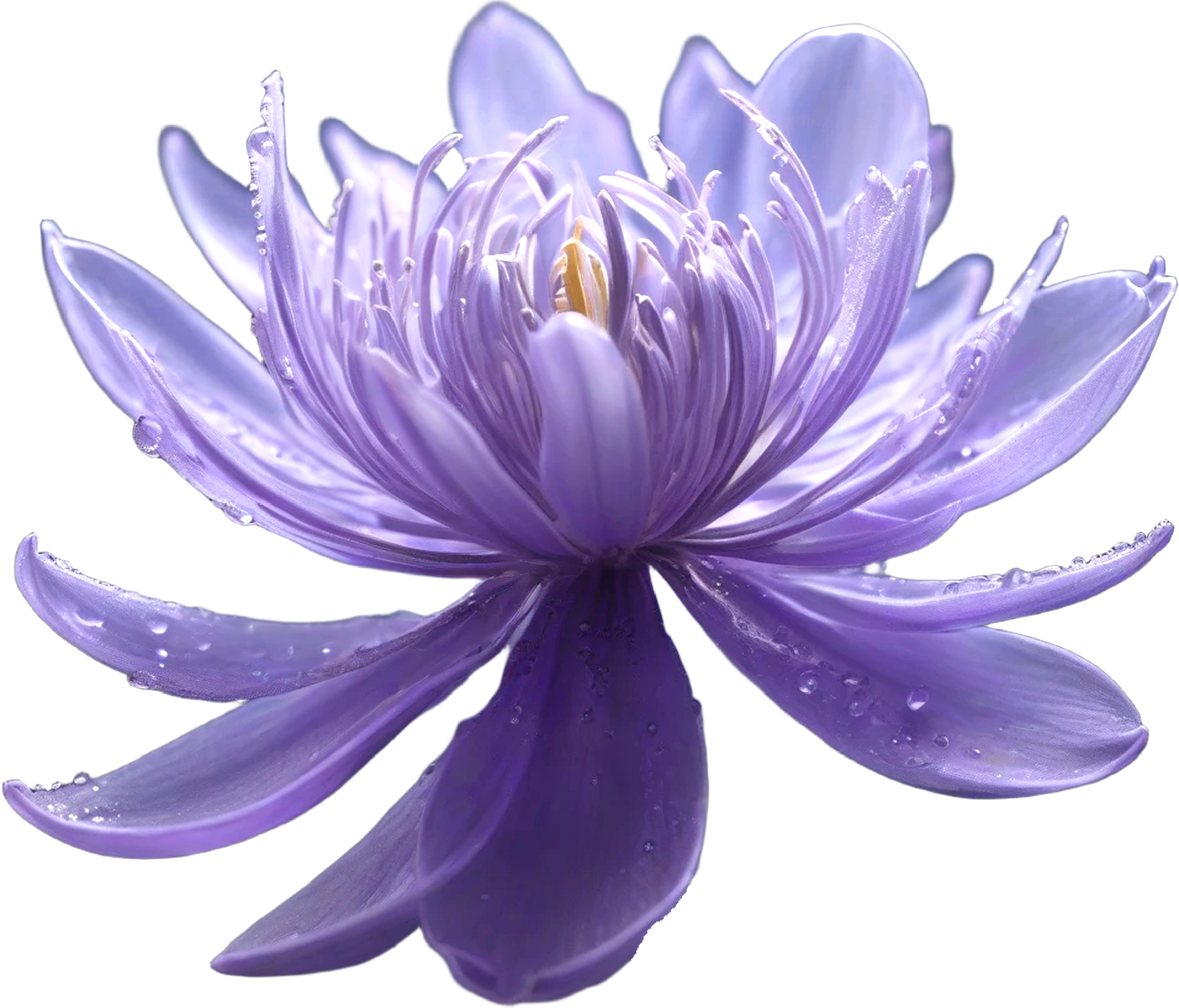 花弁の広がり、中心に向かう繊細な光の収束、瑞々しく輝く水滴が “目覚めの瞬間” を思わせる作品。