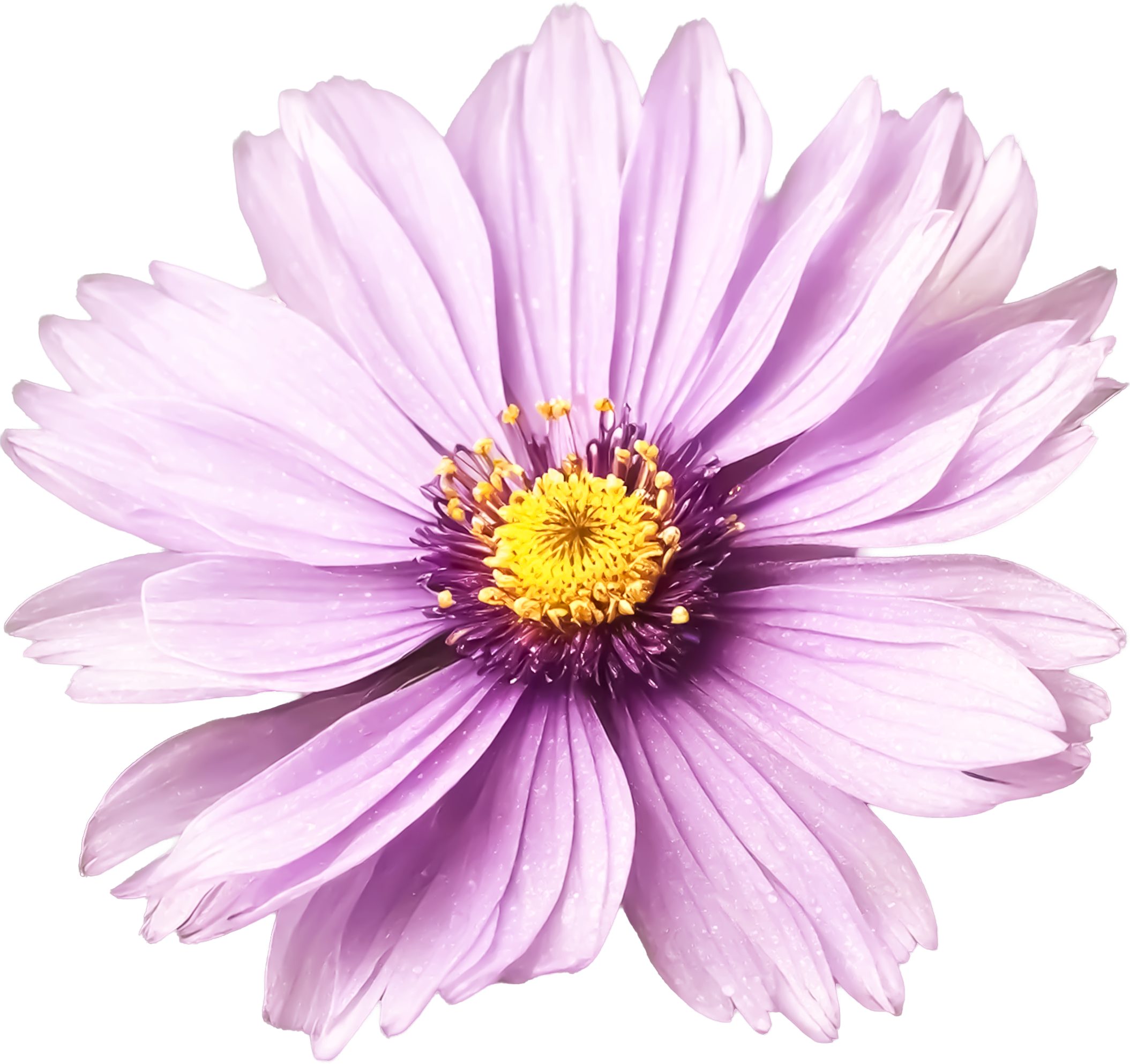 淡いライラック色の花びらに、星屑のような微細なきらめきが散りばめられたコスモス。