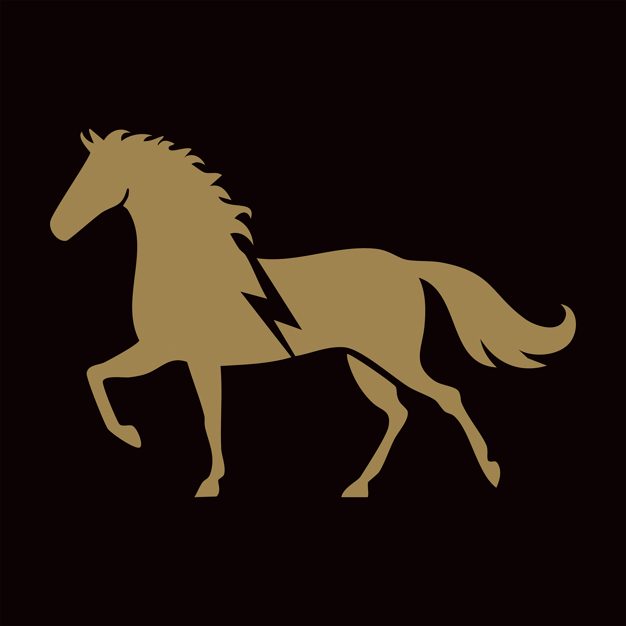 鋭い稲妻ラインが象徴する「突破力」と、疾走する馬の躍動感。