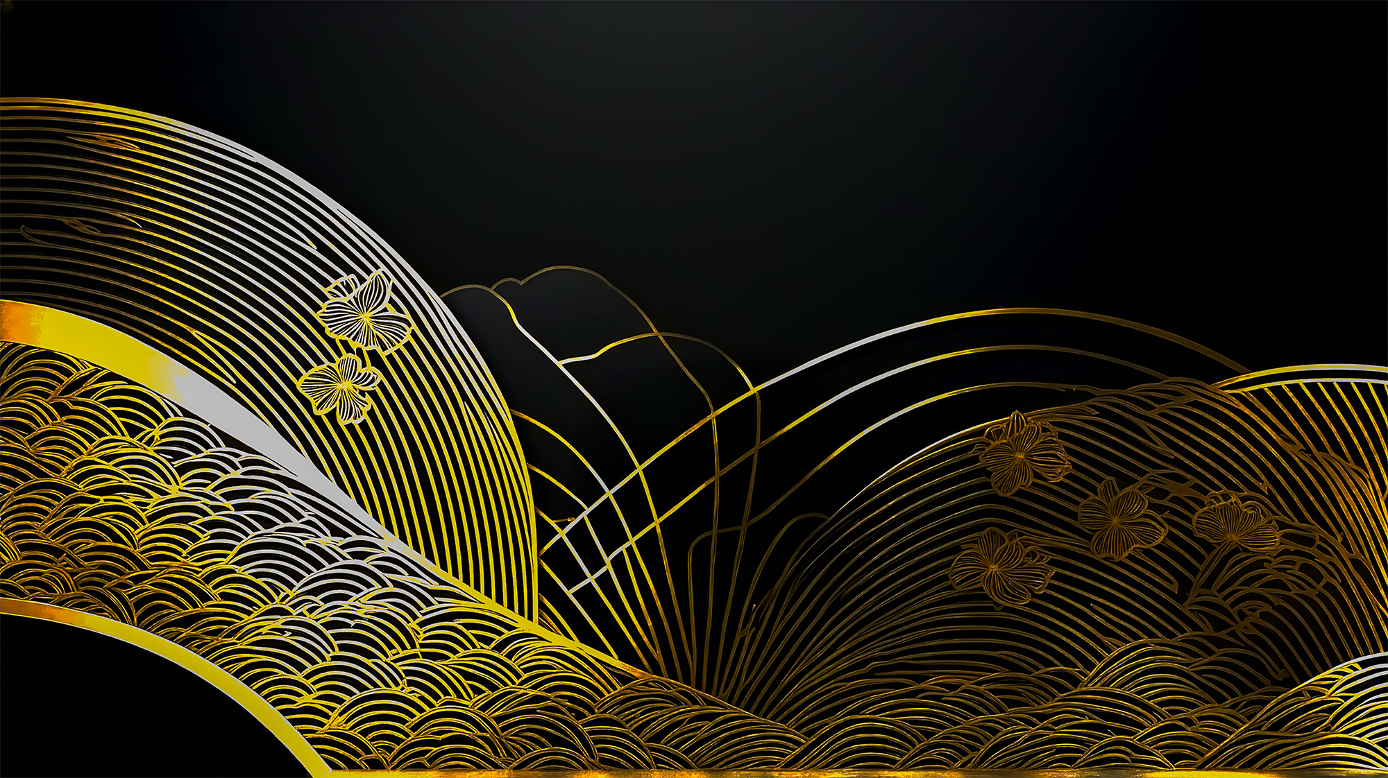 深いブラックの背景に、金線で描かれた波紋と曲線が重なり合う和風テイストの抽象背景素材です。