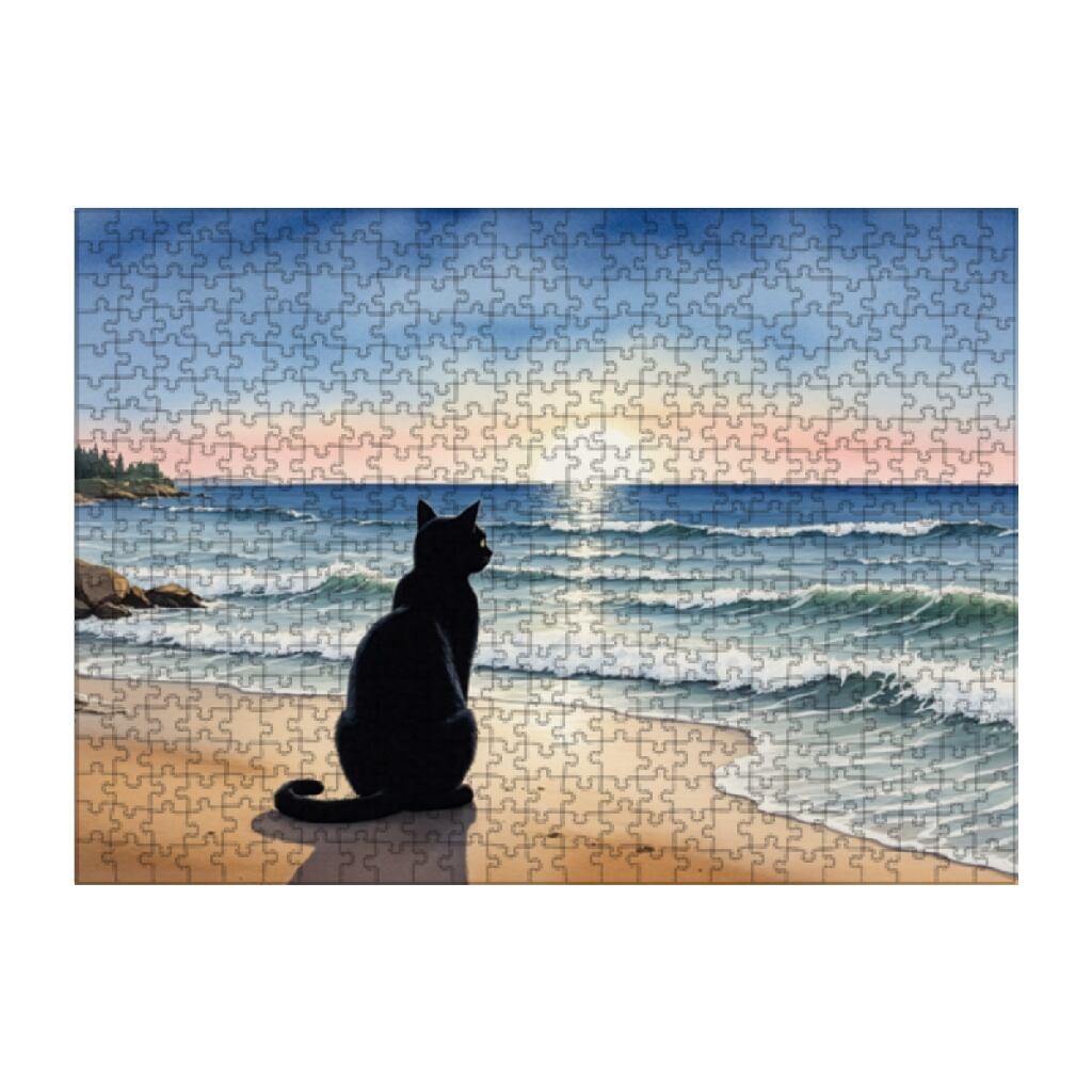 寄せては返す波を静かに見つめる黒猫を描いた、500ピースジグソーパズルです。