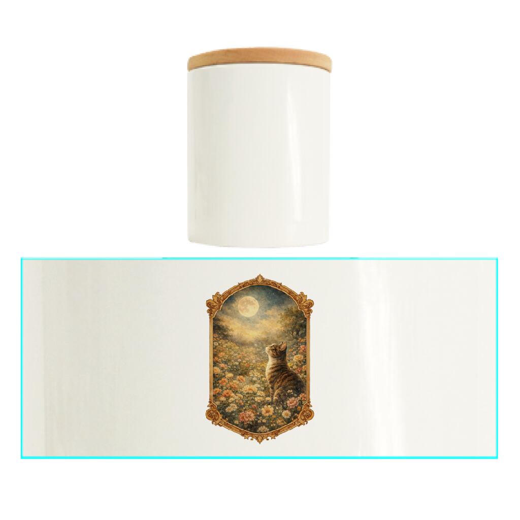 やわらかな光に包まれた花畑の中で、静かに空を見つめる猫〈すみれ〉を描いたオリジナルキャニスターです。