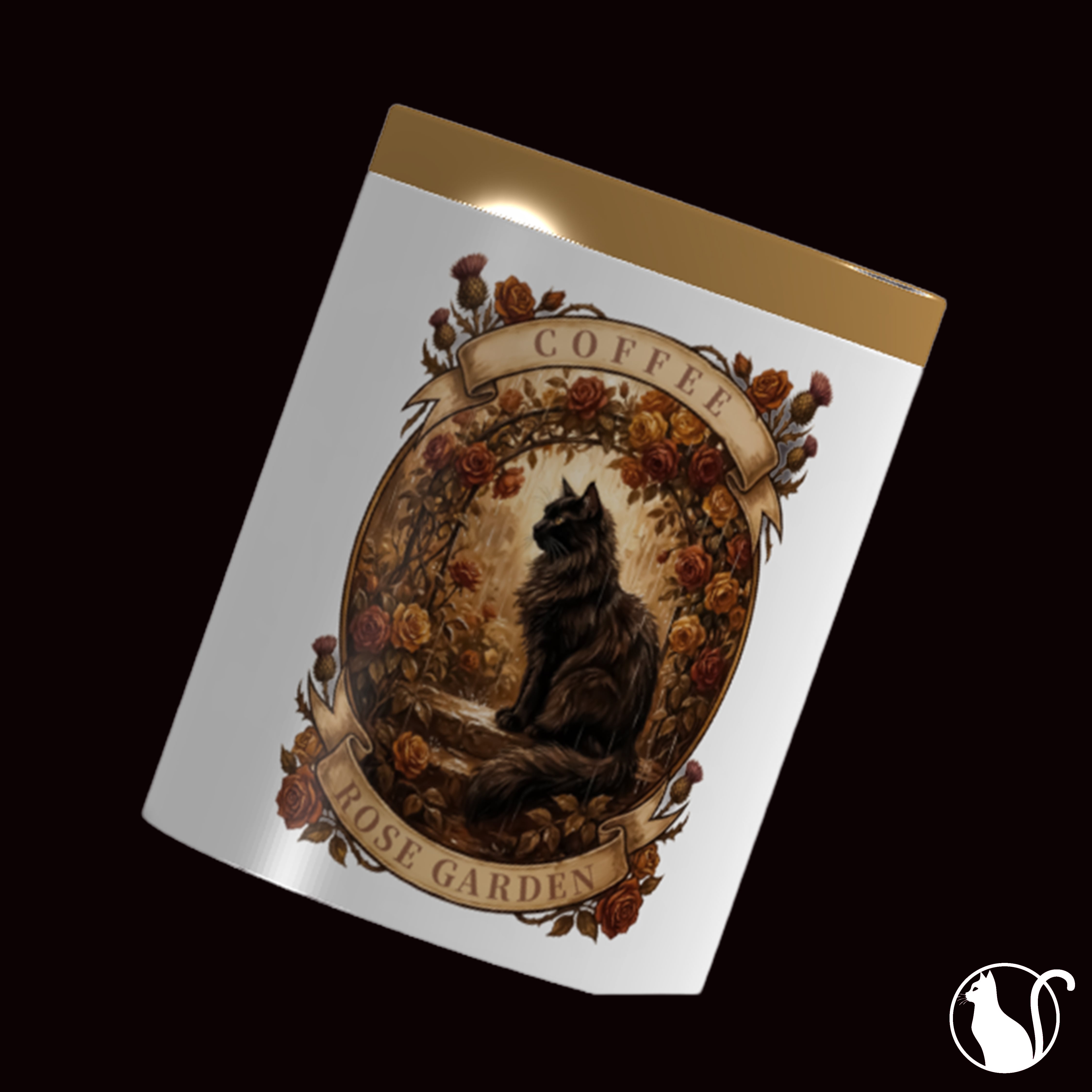 濡れた花々の間で静かに佇む黒猫を、アンティーク調エンブレムに描いたオリジナルキャニスターです。